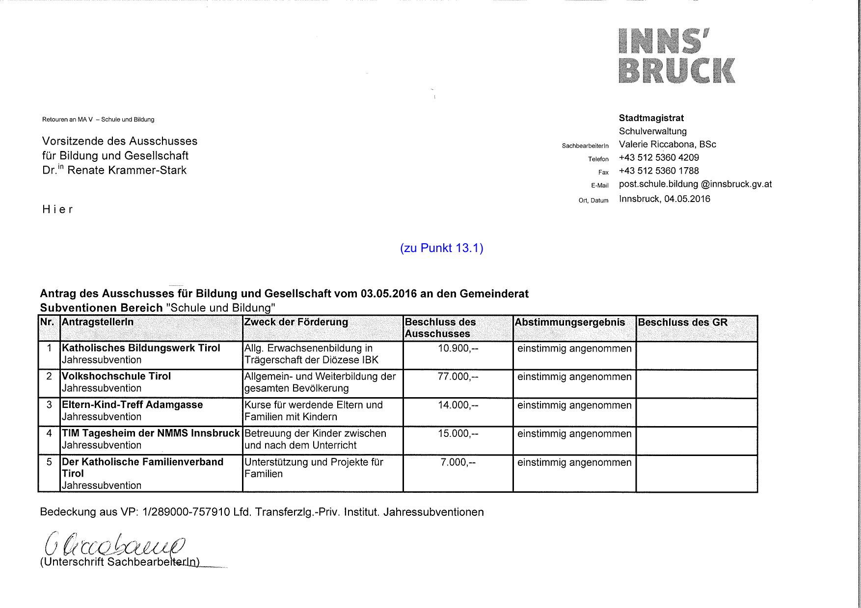 Bedeckung aus VP: 1/289000-757910 Ud, Transferzlg.-Priv. Institut. Jahressubventionen