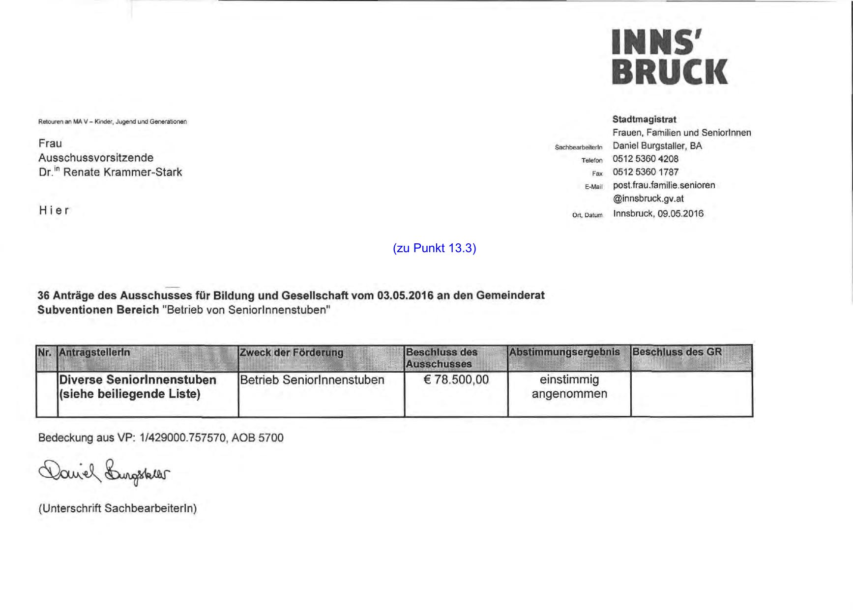 36 Anträge des Ausschusses für Bildung und Gesellschaft vom 03.05.2016 an den Gemeinderat