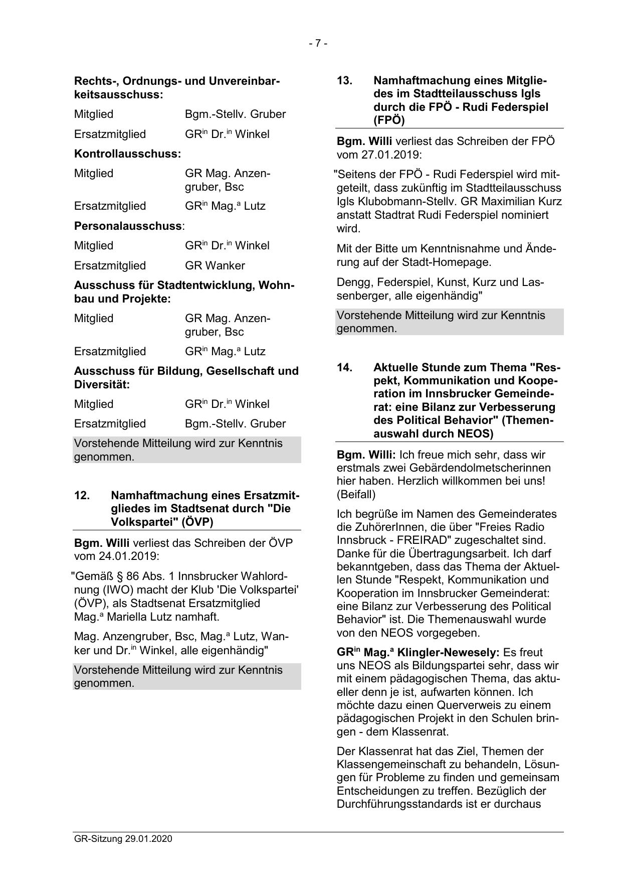 "Seitens der FPÖ - Rudi Federspiel wird mitgeteilt, dass zukünftig im Stadtteilausschuss