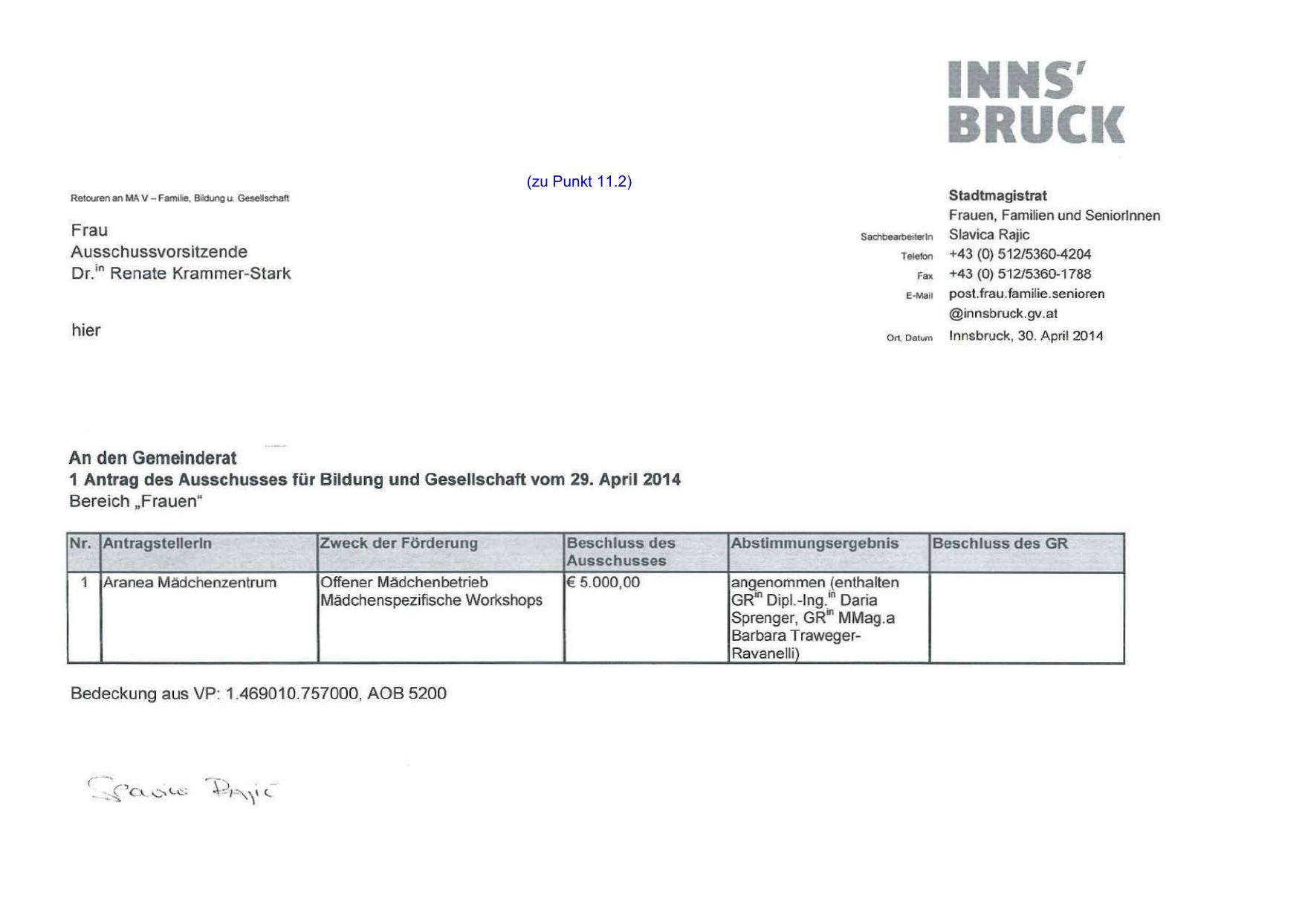 1 Antrag des Ausschusses für Bildung und Gesellschaft vom 29. April 2014