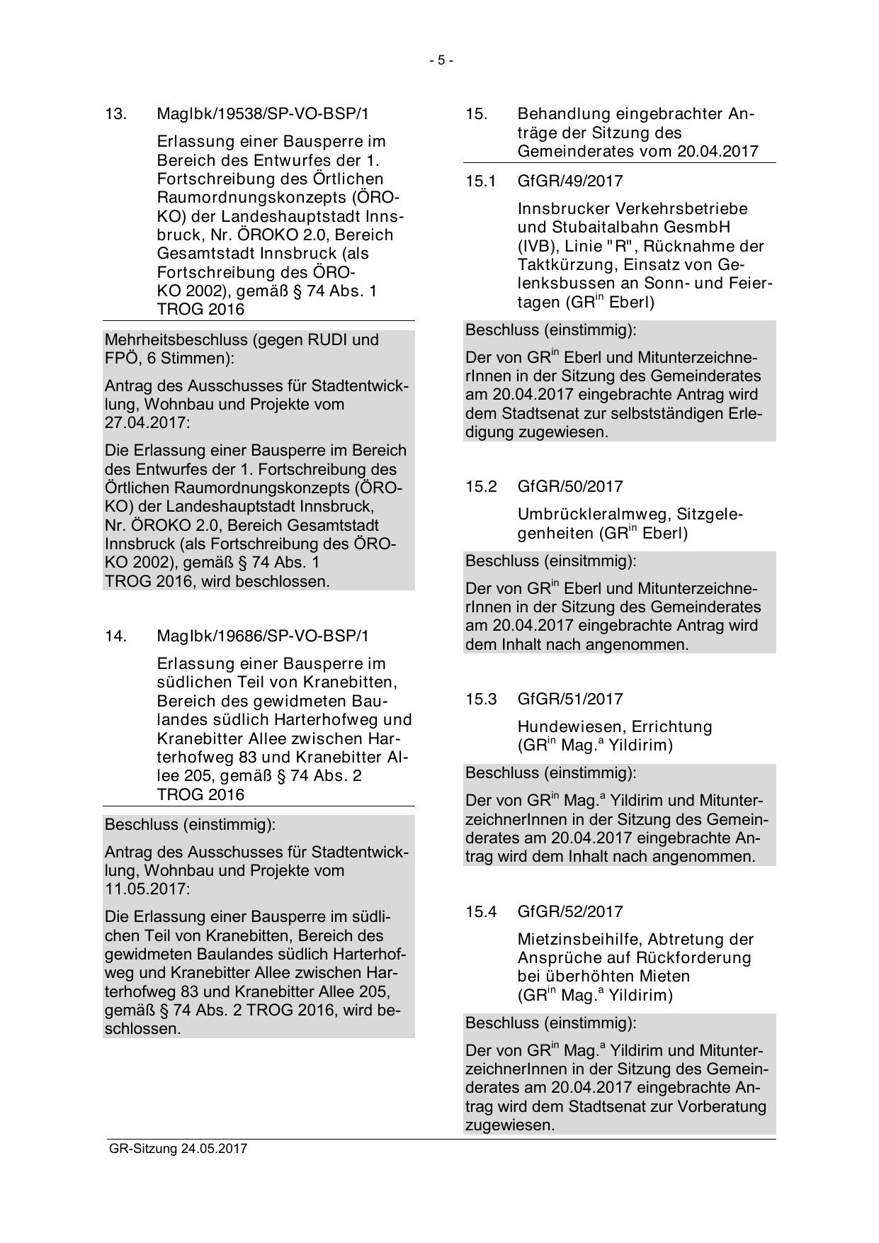 Der von GRin Mag.a Yildirim und MitunterzeichnerInnen in der Sitzung des Gemeinderates am 20.04.2017 eingebrachte Antrag wird dem Inhalt nach angenommen.
