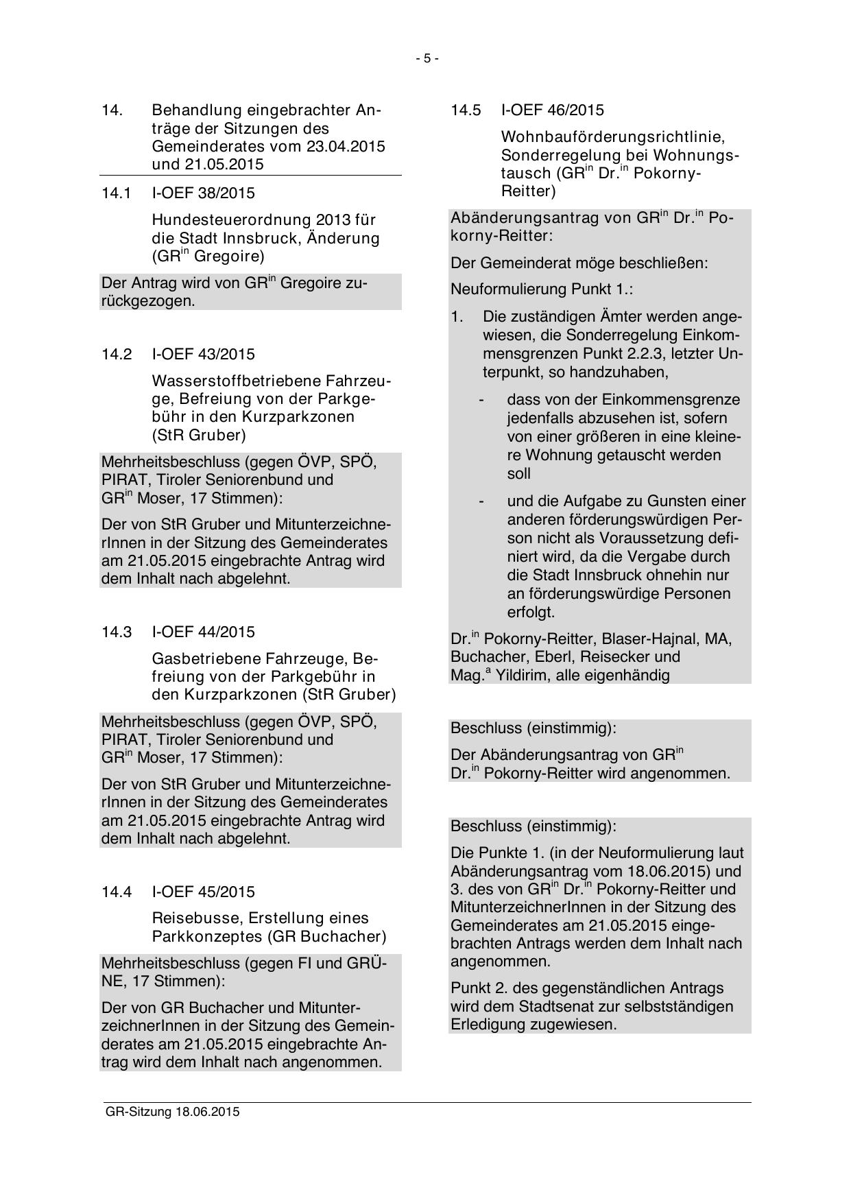 Der von GR Buchacher und MitunterzeichnerInnen in der Sitzung des Gemeinderates am 21.05.2015 eingebrachte Antrag wird dem Inhalt nach angenommen.