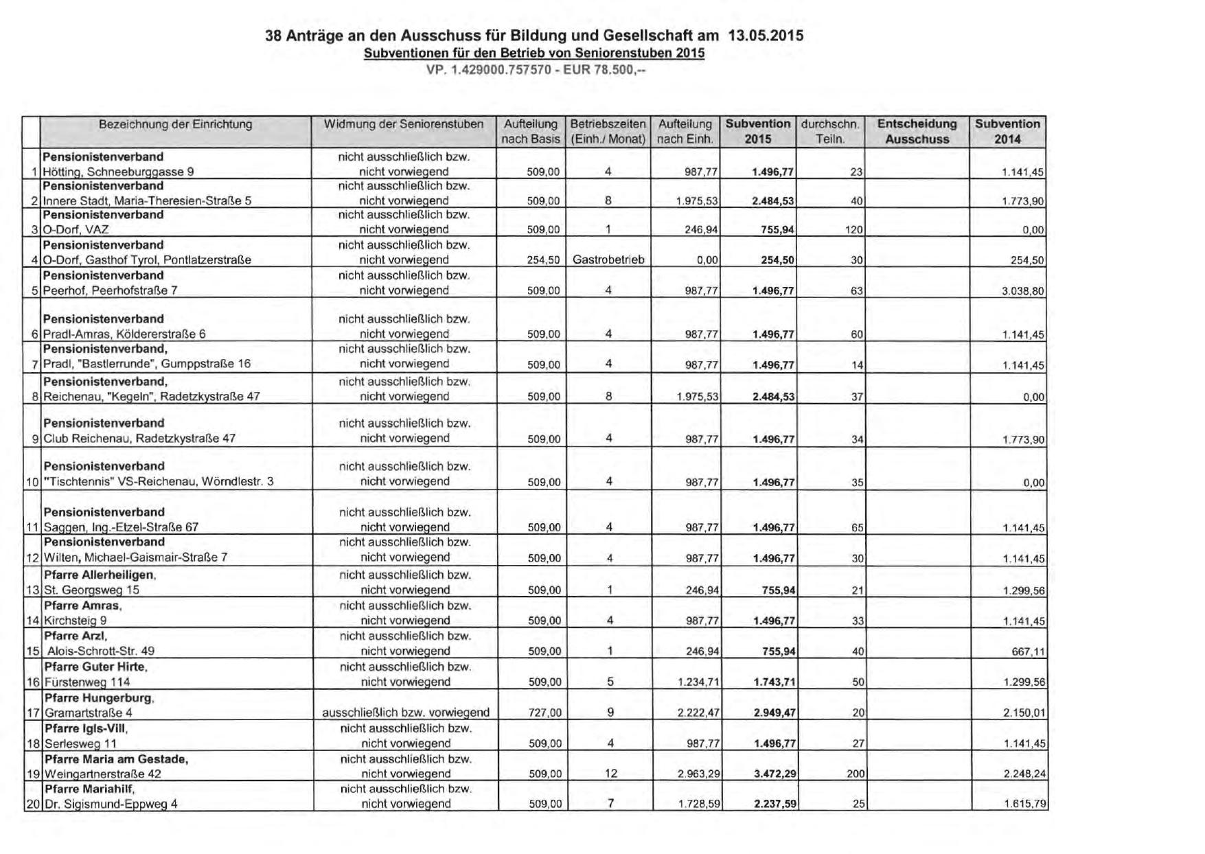 Subventionen für den Betrieb von Seniorenstuben 2015