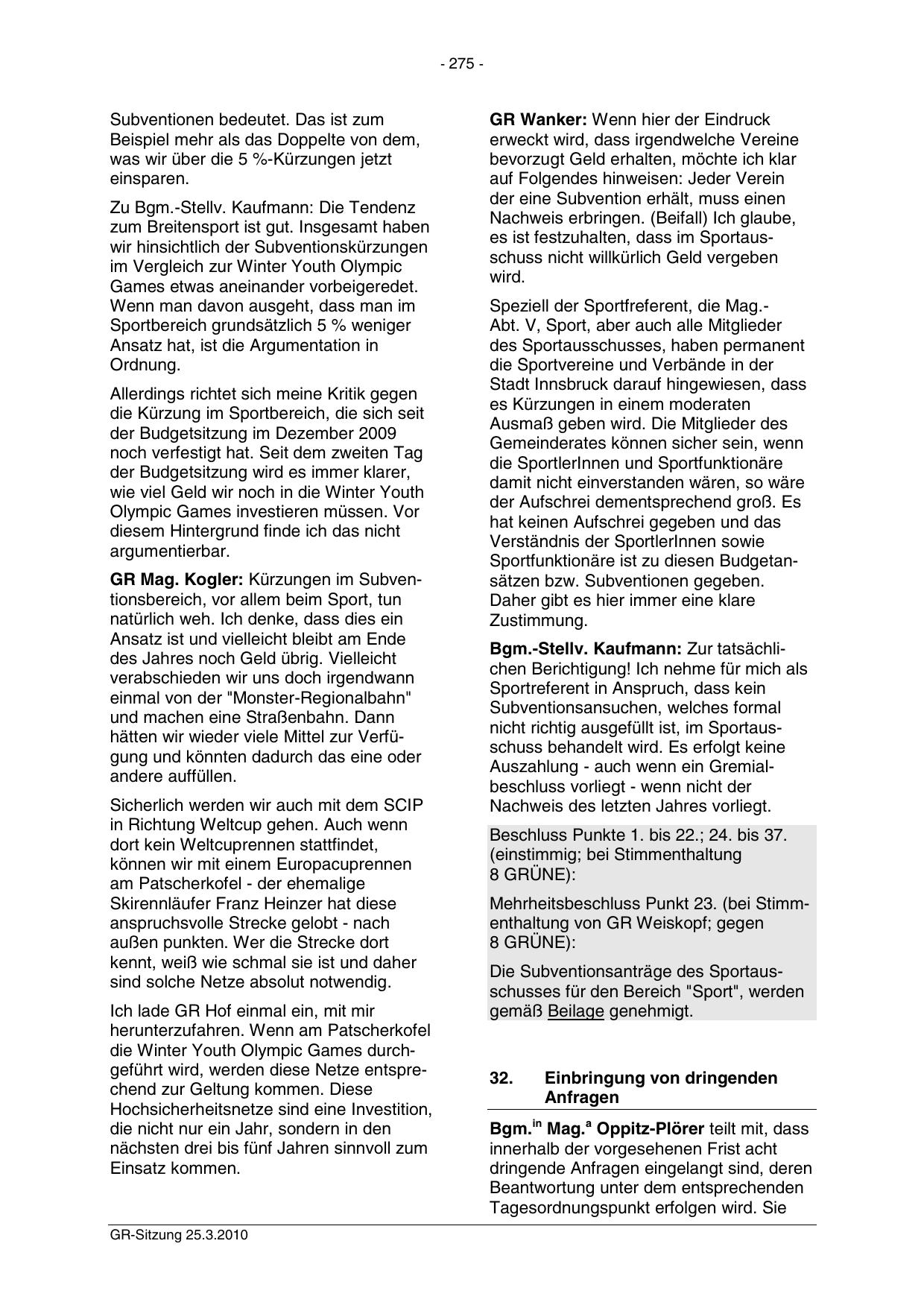 Speziell der Sportfreferent, die Mag.Abt. V, Sport, aber auch alle Mitglieder