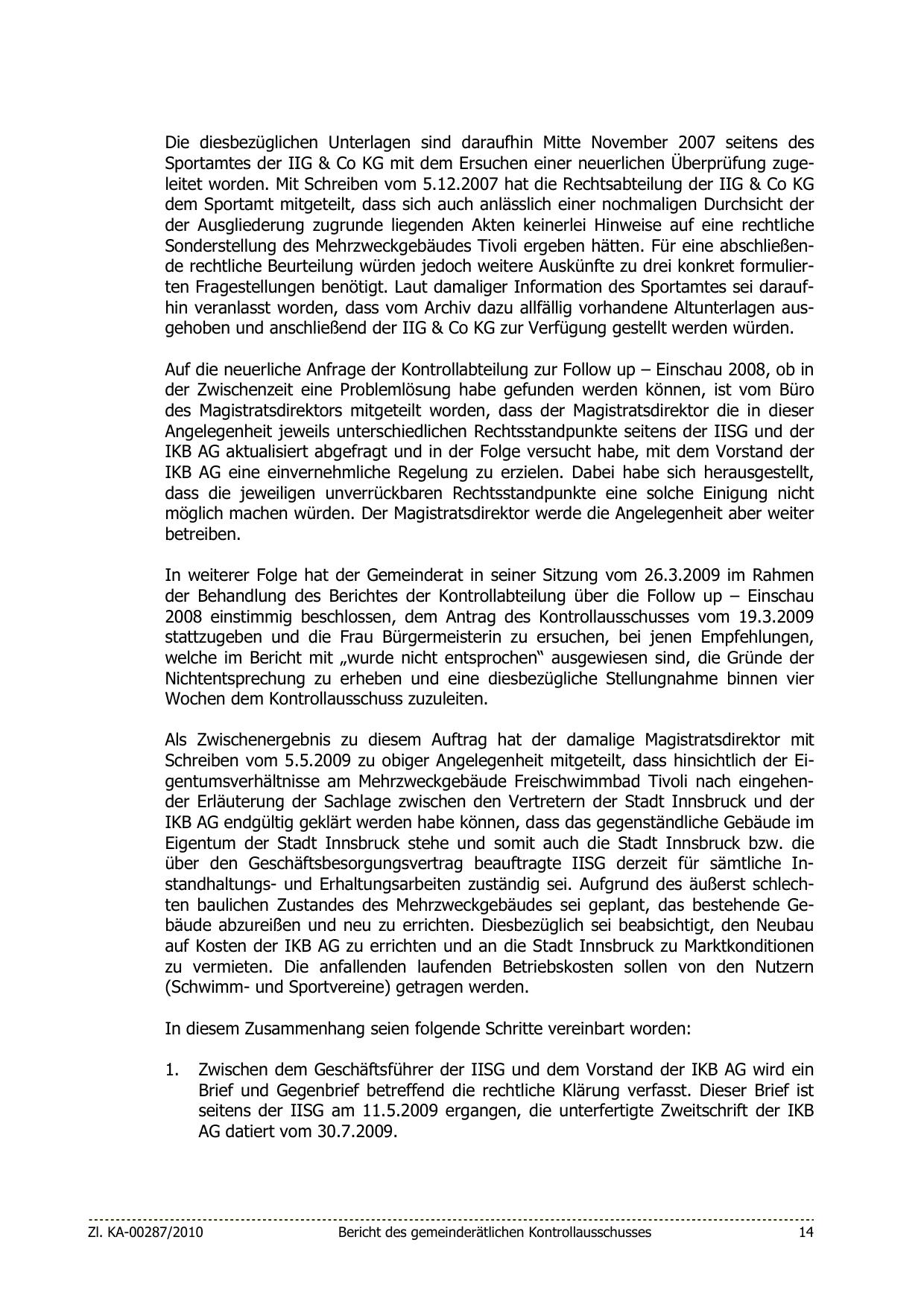 Sonderstellung des Mehrzweckgebäudes Tivoli ergeben hätten. Für eine abschließende rechtliche Beurteilung würden jedoch weitere Auskünfte zu drei konkret formulierten Fragestellungen benötigt. Laut damaliger Information des Sportamtes sei daraufhin veranlasst worden, dass vom Archiv dazu allfällig vorhandene Altunterlagen ausgehoben und anschließend der IIG & Co KG zur Verfügung gestellt werden würden.