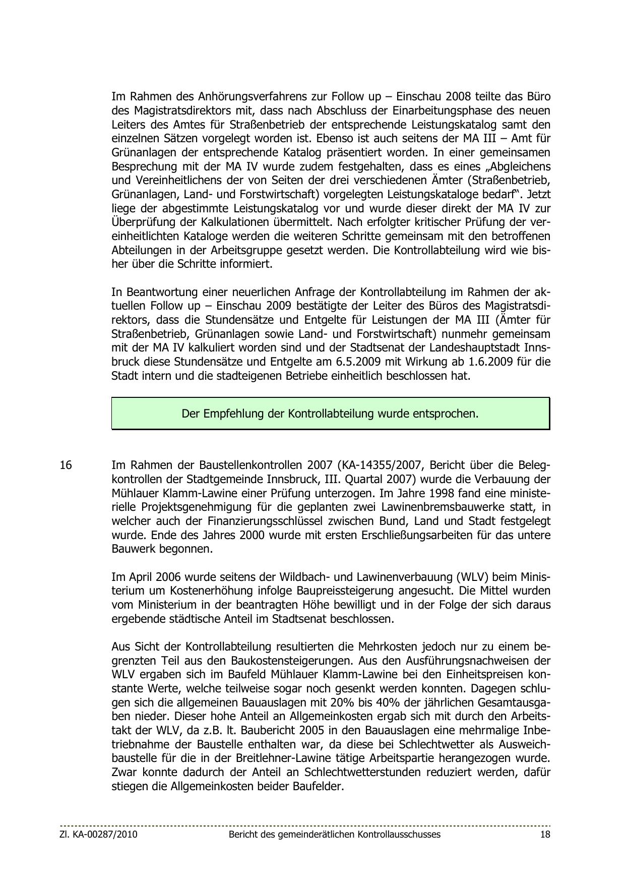 In Beantwortung einer neuerlichen Anfrage der Kontrollabteilung im Rahmen der aktuellen Follow up – Einschau 2009 bestätigte der Leiter des Büros des Magistratsdirektors, dass die Stundensätze und Entgelte für Leistungen der MA III (Ämter für