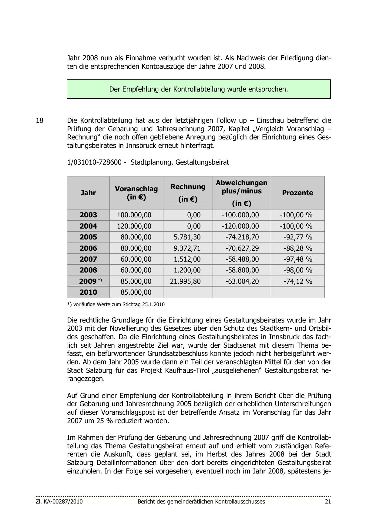 2003 mit der Novellierung des Gesetzes über den Schutz des Stadtkern- und Ortsbildes geschaffen. Da die Einrichtung eines Gestaltungsbeirates in Innsbruck das fachlich seit Jahren angestrebte Ziel war, wurde der Stadtsenat mit diesem Thema befasst, ein befürwortender Grundsatzbeschluss konnte jedoch nicht herbeigeführt werden. Ab dem Jahr 2005 wurde dann ein Teil der veranschlagten Mittel für den von der
