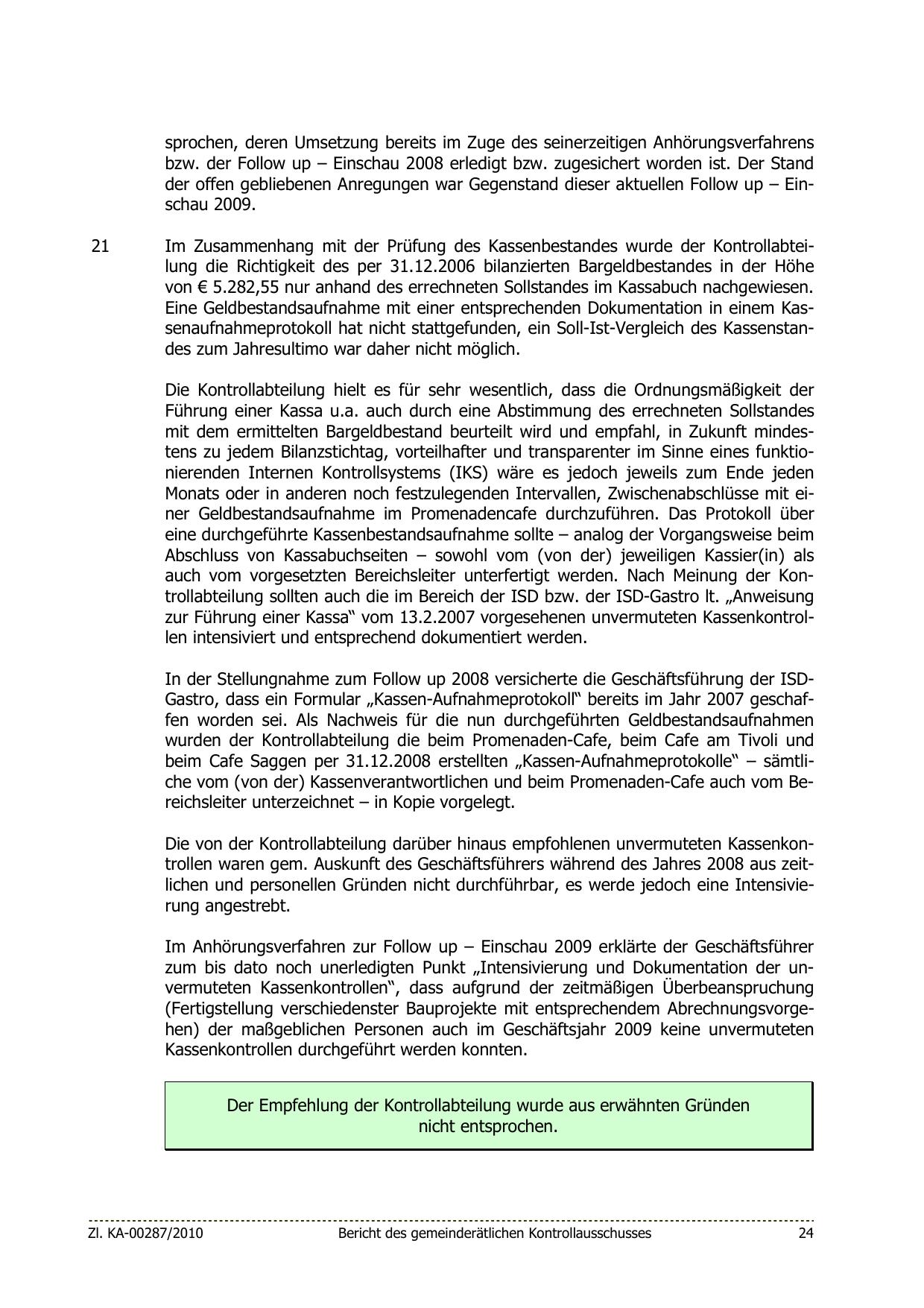 Die von der Kontrollabteilung darüber hinaus empfohlenen unvermuteten Kassenkontrollen waren gem. Auskunft des Geschäftsführers während des Jahres 2008 aus zeitlichen und personellen Gründen nicht durchführbar, es werde jedoch eine Intensivierung angestrebt.