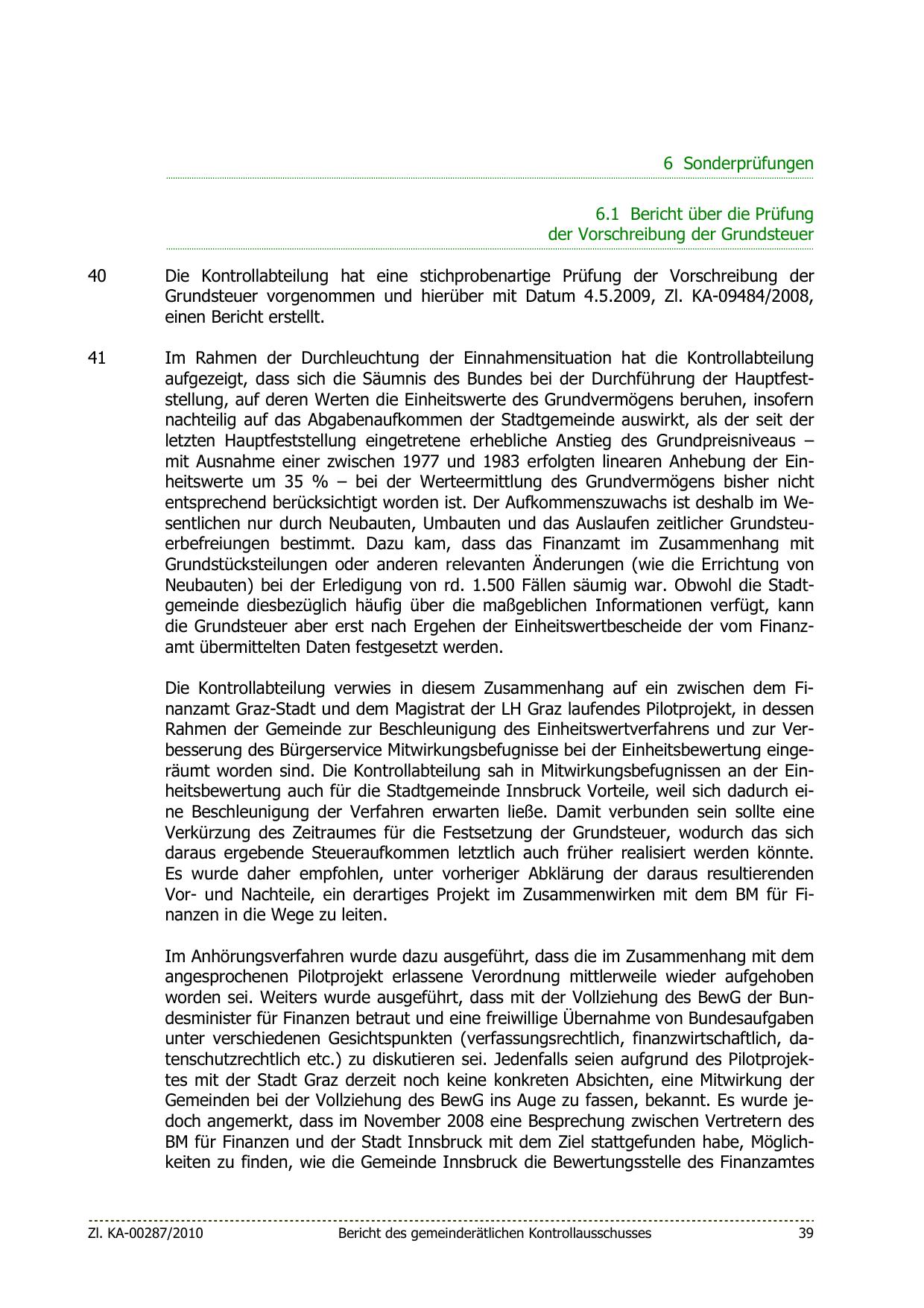 Rahmen der Gemeinde zur Beschleunigung des Einheitswertverfahrens und zur Verbesserung des Bürgerservice Mitwirkungsbefugnisse bei der Einheitsbewertung eingeräumt worden sind. Die Kontrollabteilung sah in Mitwirkungsbefugnissen an der Einheitsbewertung auch für die Stadtgemeinde Innsbruck Vorteile, weil sich dadurch eine Beschleunigung der Verfahren erwarten ließe. Damit verbunden sein sollte eine