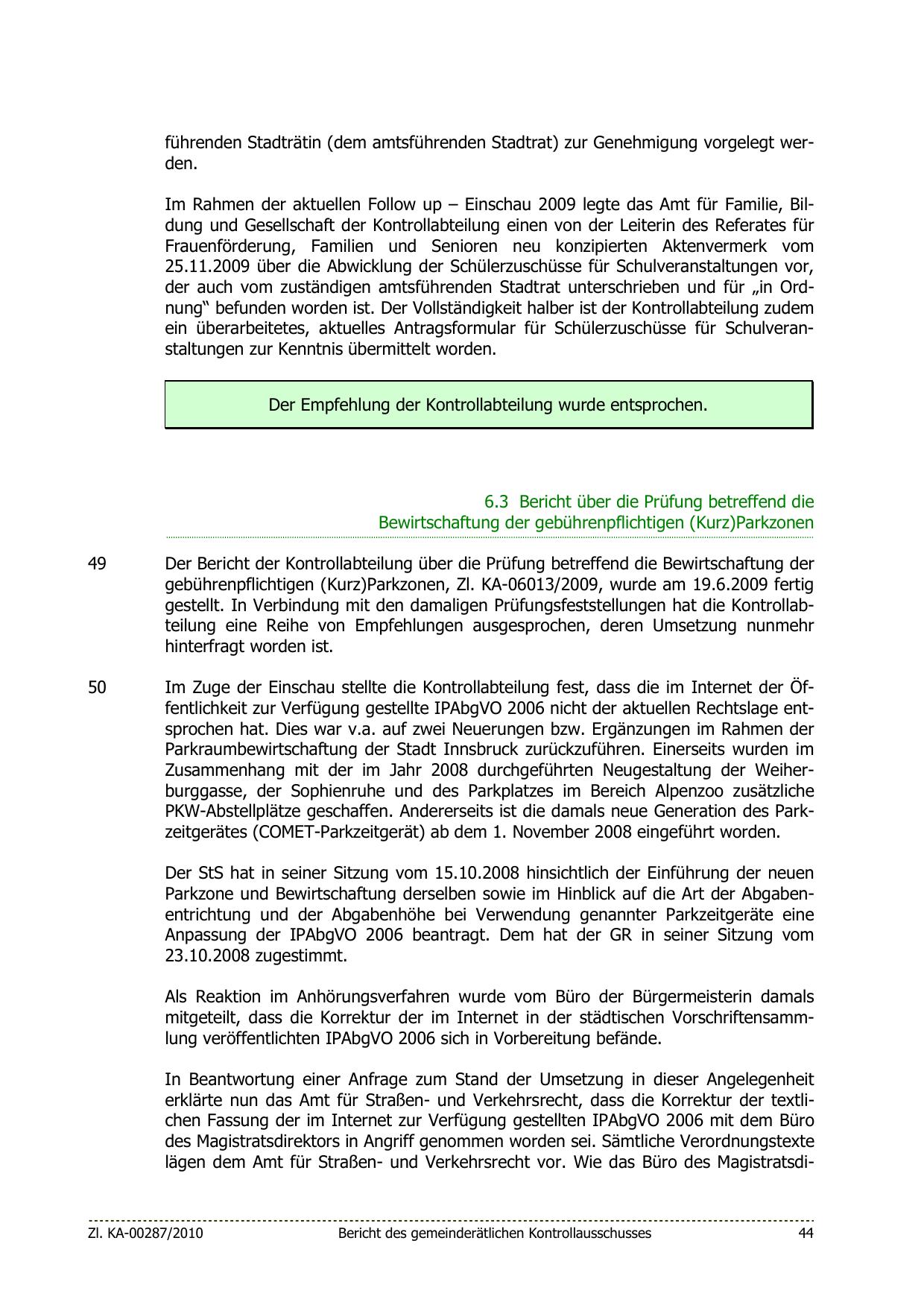 Im Rahmen der aktuellen Follow up – Einschau 2009 legte das Amt für Familie, Bildung und Gesellschaft der Kontrollabteilung einen von der Leiterin des Referates für