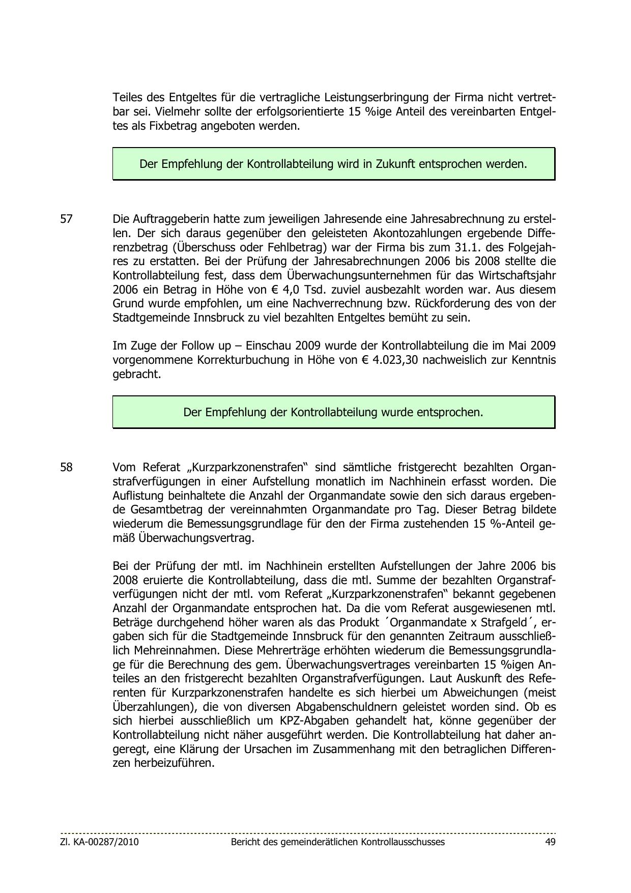 Beträge durchgehend höher waren als das Produkt ´Organmandate x Strafgeld´, ergaben sich für die Stadtgemeinde Innsbruck für den genannten Zeitraum ausschließlich Mehreinnahmen. Diese Mehrerträge erhöhten wiederum die Bemessungsgrundlage für die Berechnung des gem. Überwachungsvertrages vereinbarten 15 %igen Anteiles an den fristgerecht bezahlten Organstrafverfügungen. Laut Auskunft des Referenten für Kurzparkzonenstrafen handelte es sich hierbei um Abweichungen (meist