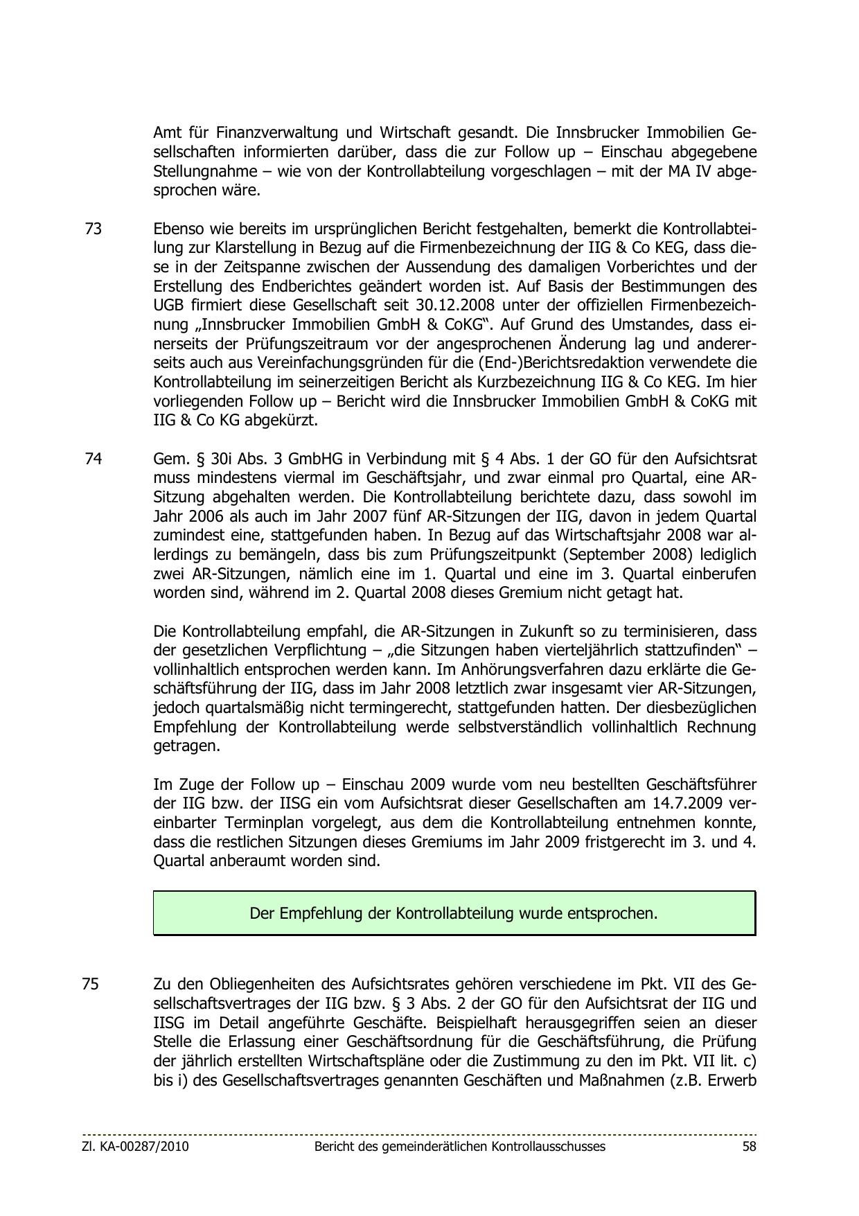 vollinhaltlich entsprochen werden kann. Im Anhörungsverfahren dazu erklärte die Geschäftsführung der IIG, dass im Jahr 2008 letztlich zwar insgesamt vier AR-Sitzungen,