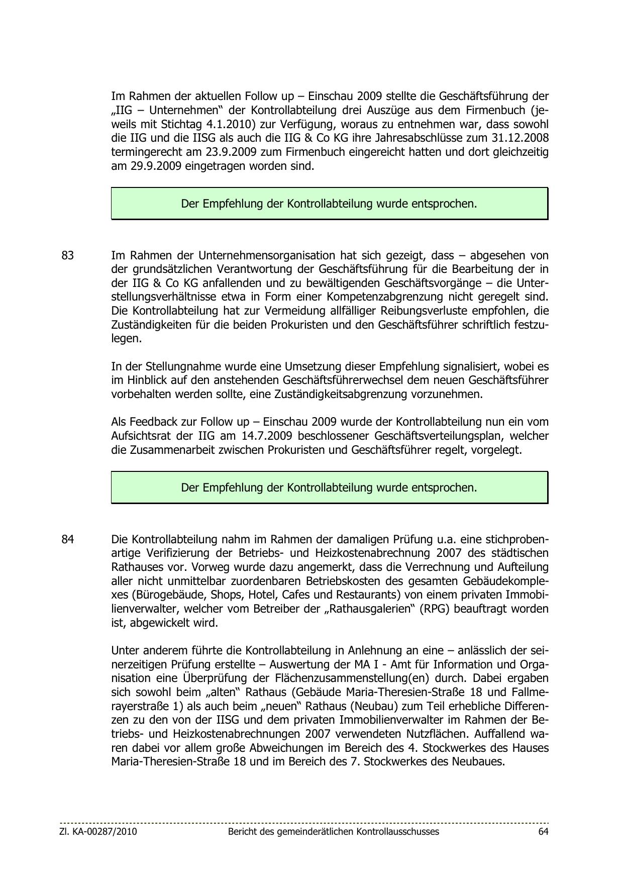 sich sowohl beim „alten“ Rathaus (Gebäude Maria-Theresien-Straße 18 und Fallmerayerstraße 1) als auch beim „neuen“ Rathaus (Neubau) zum Teil erhebliche Differenzen zu den von der IISG und dem privaten Immobilienverwalter im Rahmen der Betriebs- und Heizkostenabrechnungen 2007 verwendeten Nutzflächen. Auffallend waren dabei vor allem große Abweichungen im Bereich des 4. Stockwerkes des Hauses