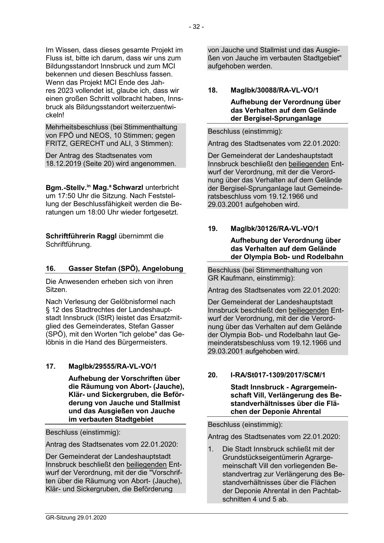 § 12 des Stadtrechtes der Landeshauptstadt Innsbruck (IStR) leistet das Ersatzmitglied des Gemeinderates, Stefan Gasser