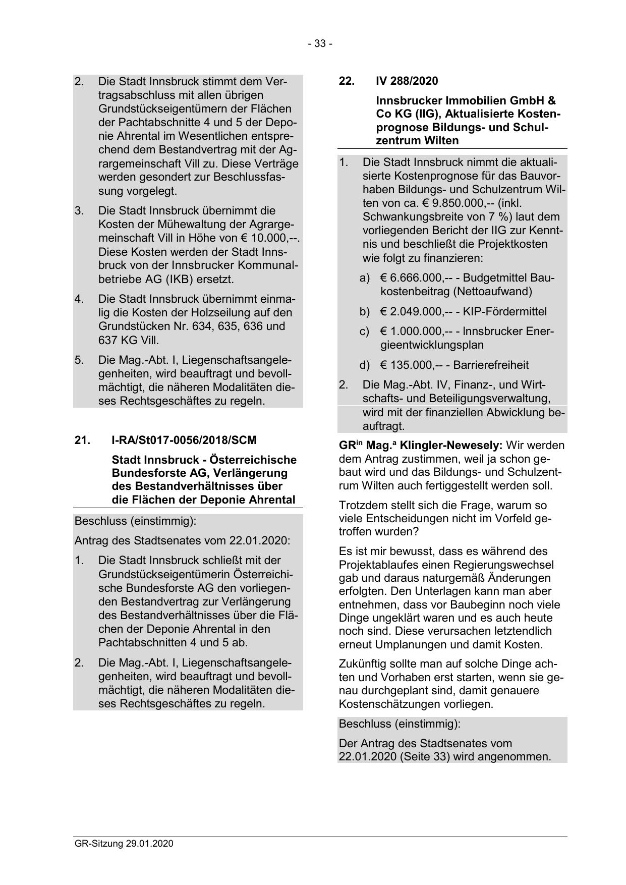 dem Antrag zustimmen, weil ja schon gebaut wird und das Bildungs- und Schulzentrum Wilten auch fertiggestellt werden soll.