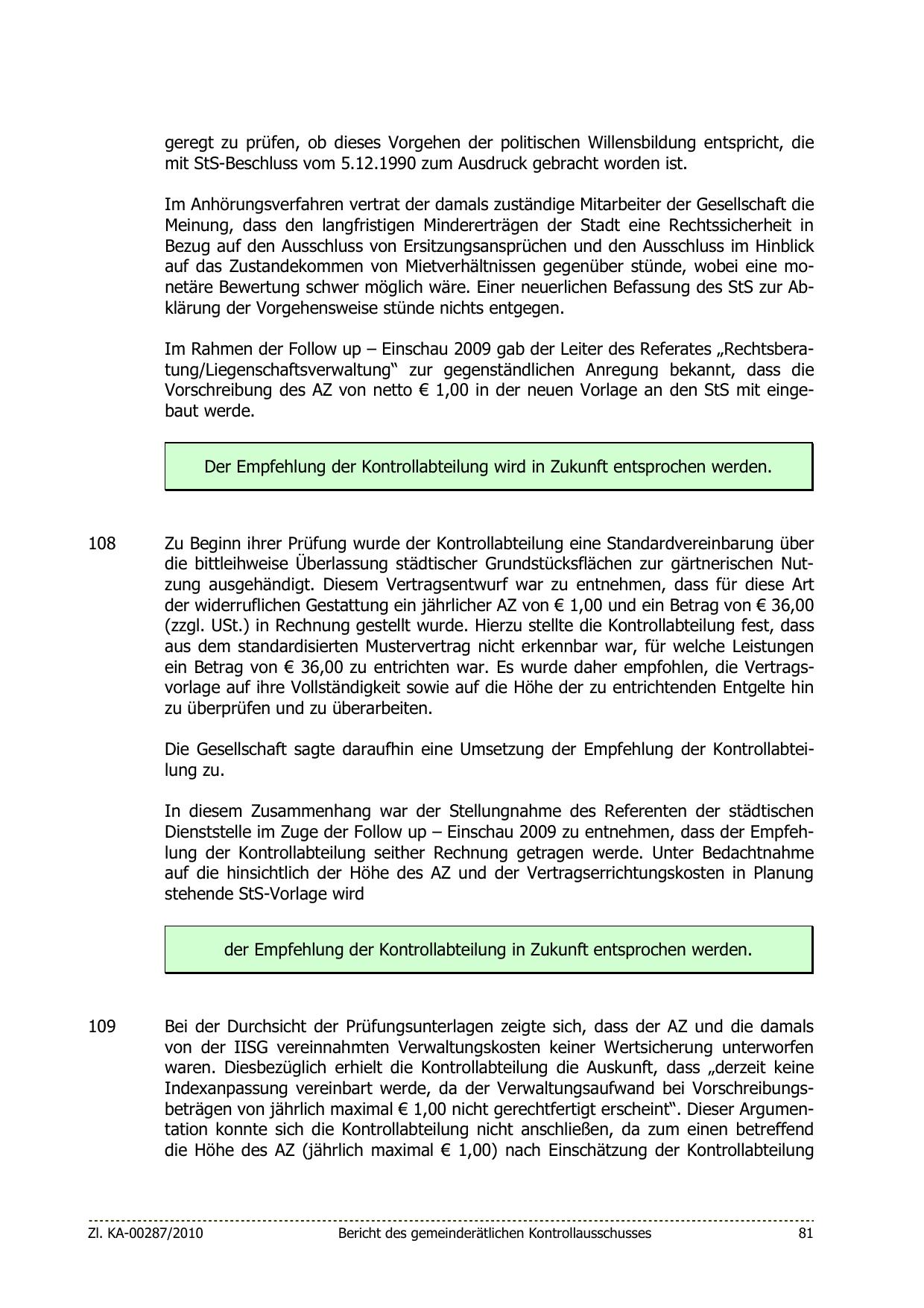 Im Rahmen der Follow up – Einschau 2009 gab der Leiter des Referates „Rechtsberatung/Liegenschaftsverwaltung“ zur gegenständlichen Anregung bekannt, dass die