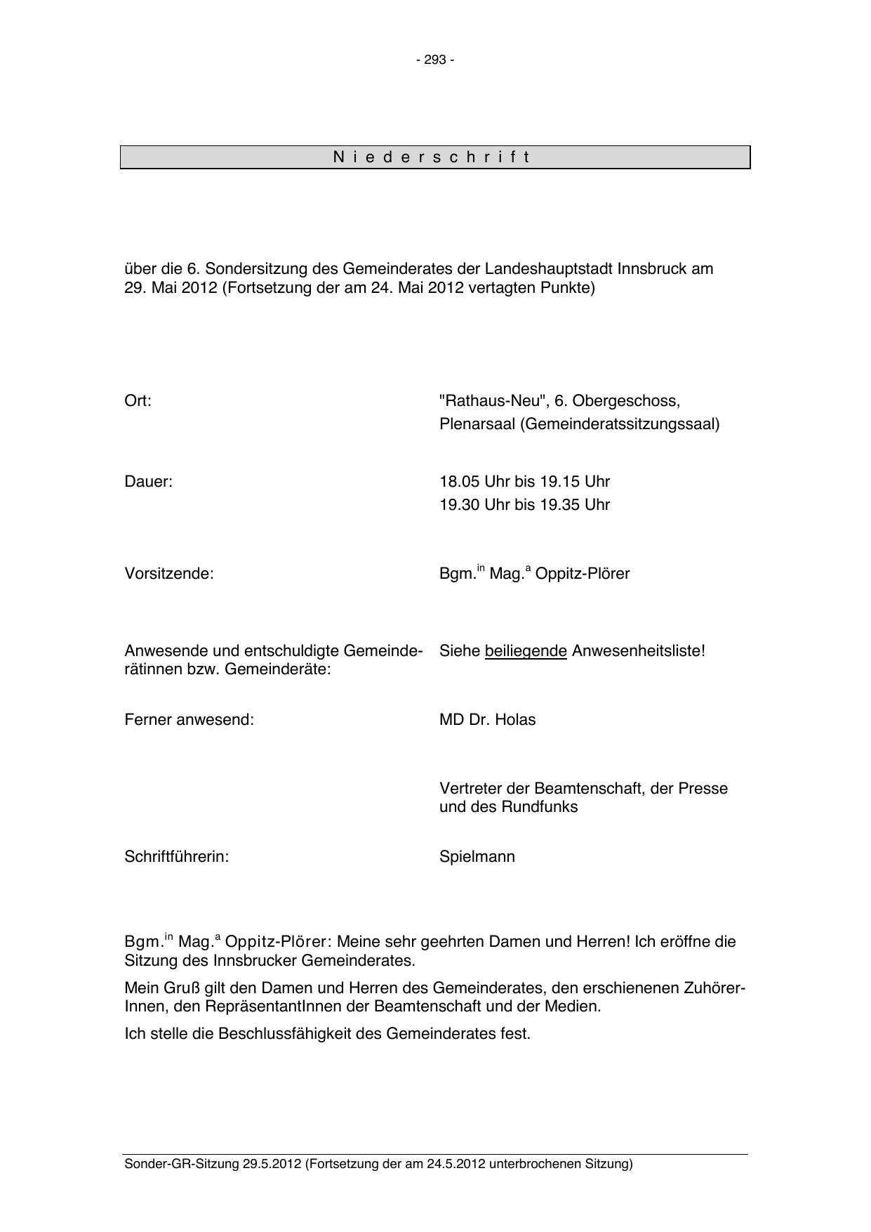 über die 6. Sondersitzung des Gemeinderates der Landeshauptstadt Innsbruck am