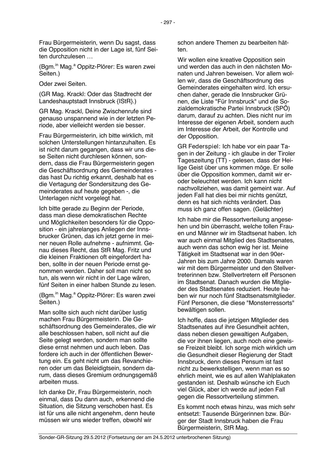und Möglichkeiten besonders für die Opposition - ein jahrelanges Anliegen der Innsbrucker Grünen, das ich jetzt gerne in meiner neuen Rolle aufnehme - aufnimmt. Genau dieses Recht, das StR Mag. Fritz und