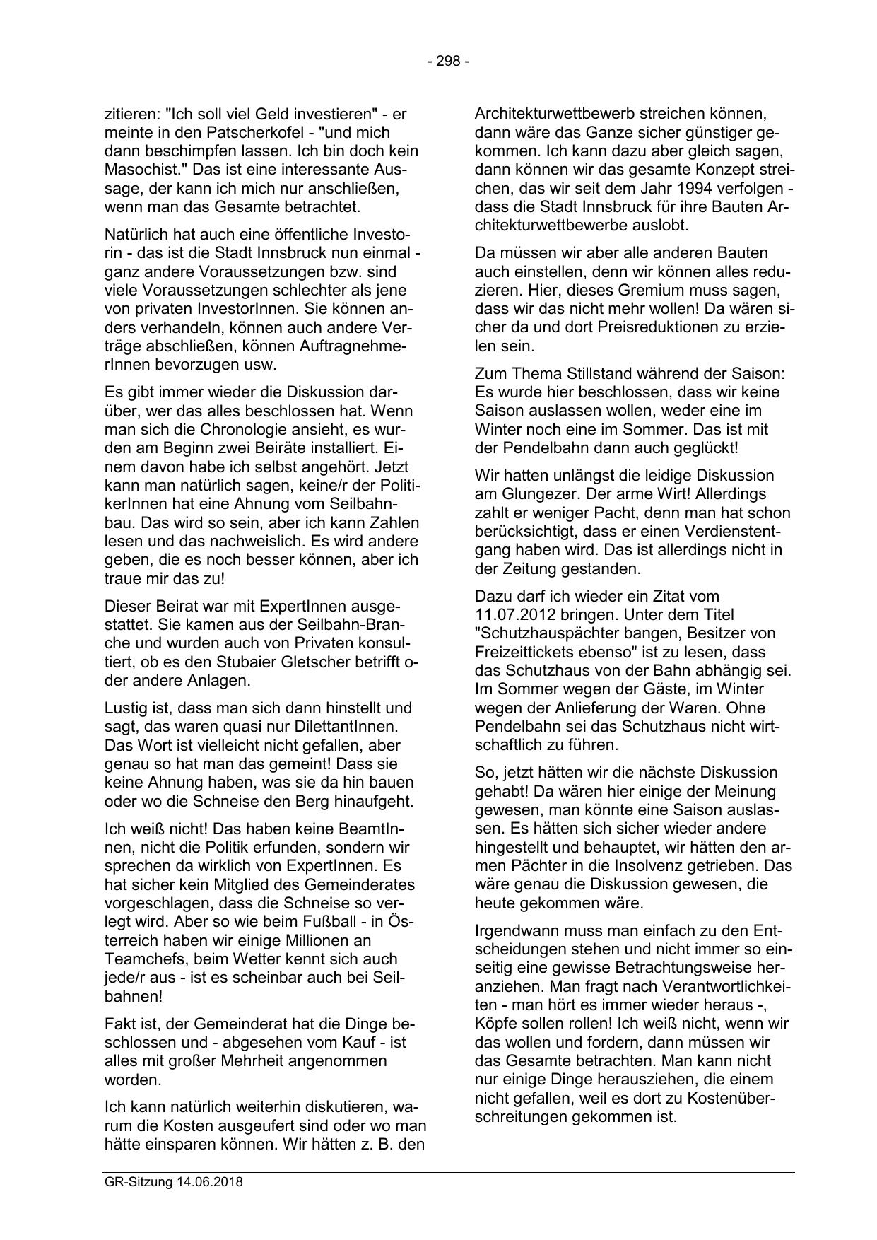 kann man natürlich sagen, keine/r der PolitikerInnen hat eine Ahnung vom Seilbahnbau. Das wird so sein, aber ich kann Zahlen