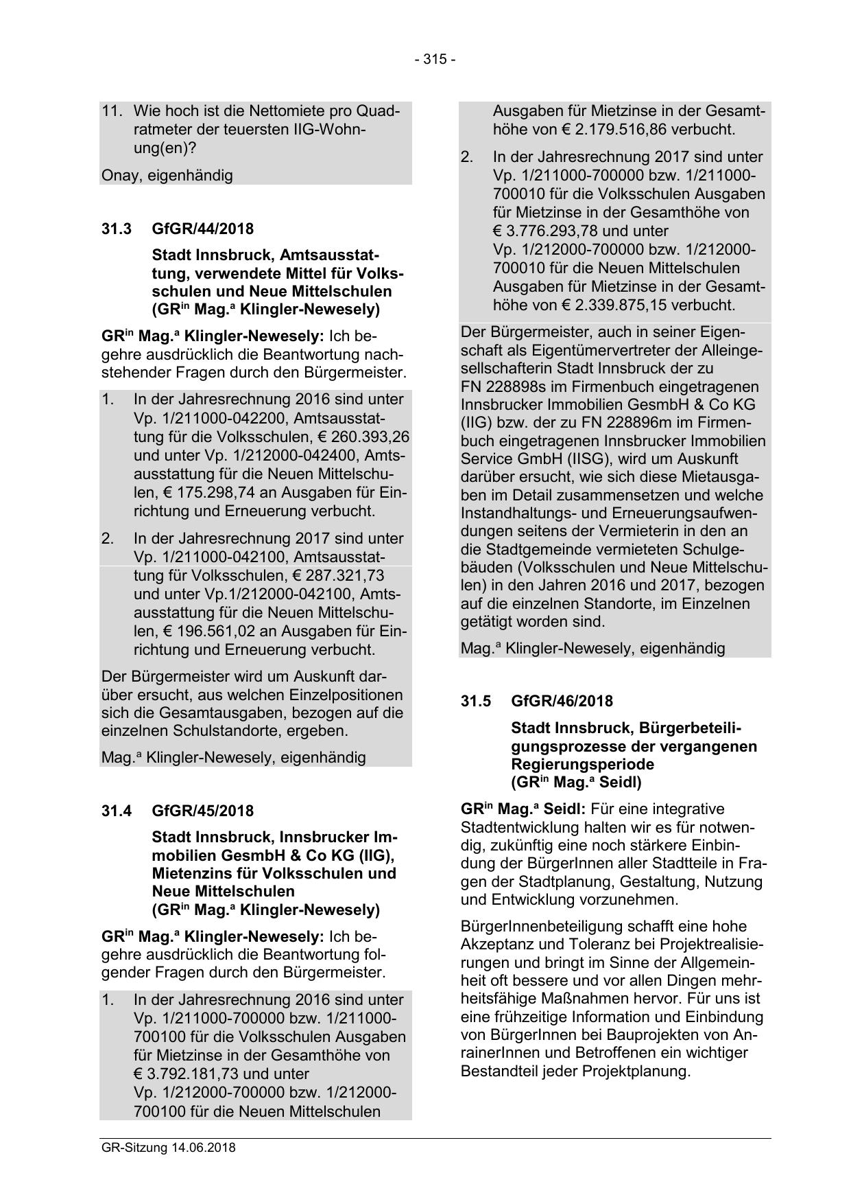 GRin Mag.a Klingler-Newesely: Ich begehre ausdrücklich die Beantwortung nachstehender Fragen durch den Bürgermeister.