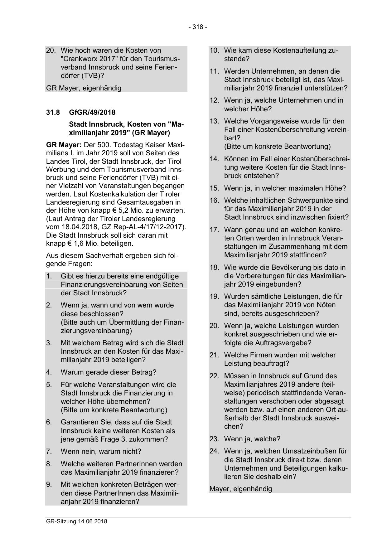 Stadt Innsbruck, Kosten von "Maximilianjahr 2019" (GR Mayer)