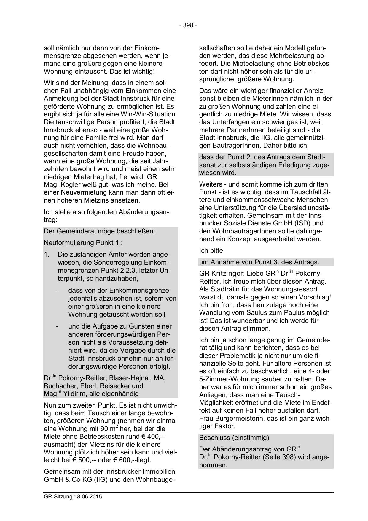 Dr.in Pokorny-Reitter (Seite 398) wird angenommen.