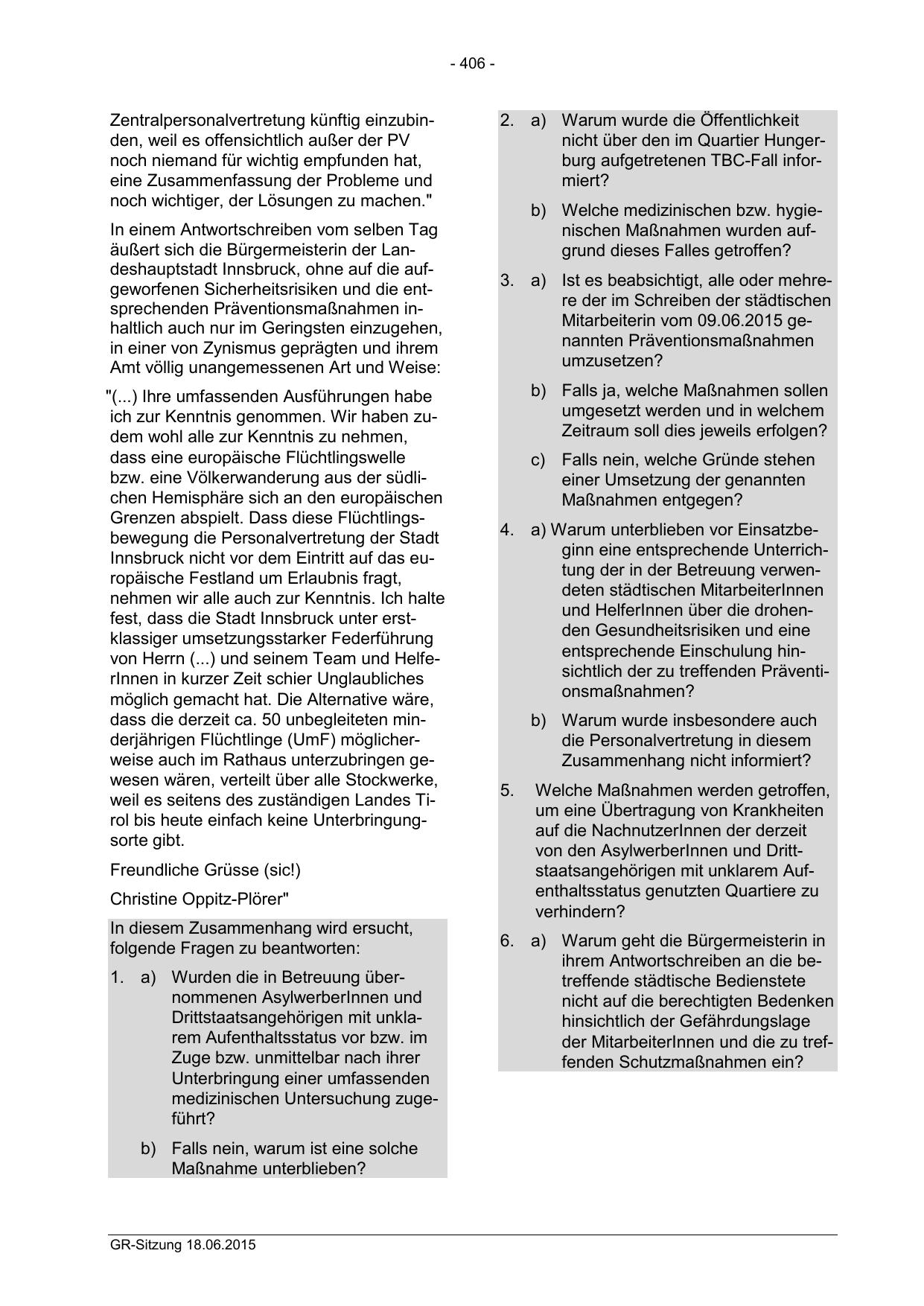 äußert sich die Bürgermeisterin der Landeshauptstadt Innsbruck, ohne auf die aufgeworfenen Sicherheitsrisiken und die entsprechenden Präventionsmaßnahmen inhaltlich auch nur im Geringsten einzugehen,