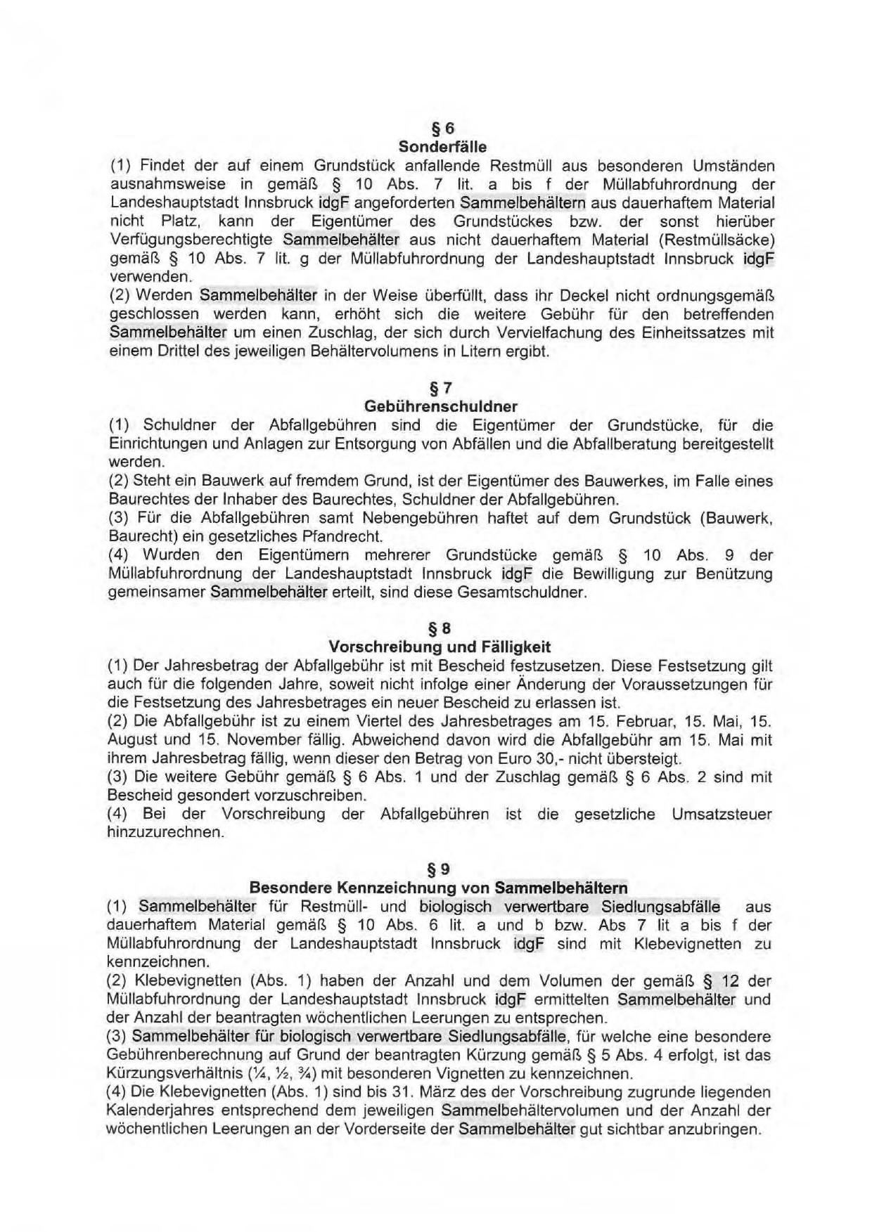 Müllabfuhrordnung der Landeshauptstadt Innsbruck idgF ermittelten Sammelbehälter und