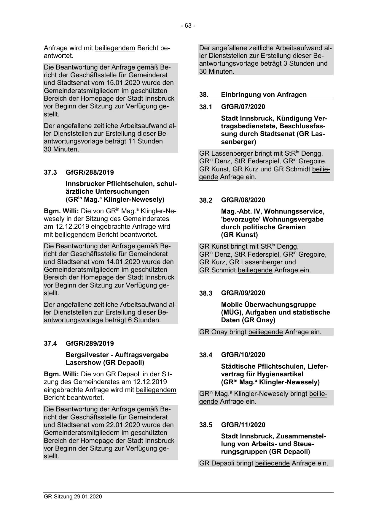 Bgm. Willi: Die von GR Depaoli in der Sitzung des Gemeinderates am 12.12.2019