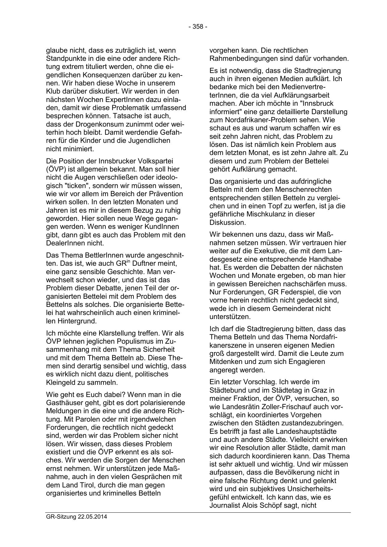 Das Thema BettlerInnen wurde angeschnitten. Das ist, wie auch GRin Duftner meint,