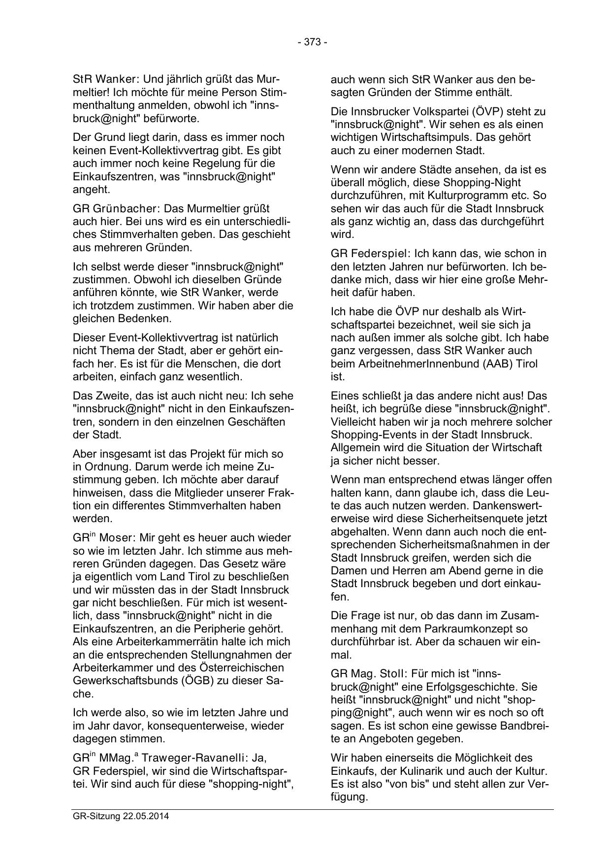StR Wanker: Und jährlich grüßt das Murmeltier! Ich möchte für meine Person Stimmenthaltung anmelden, obwohl ich "innsbruck@night" befürworte.