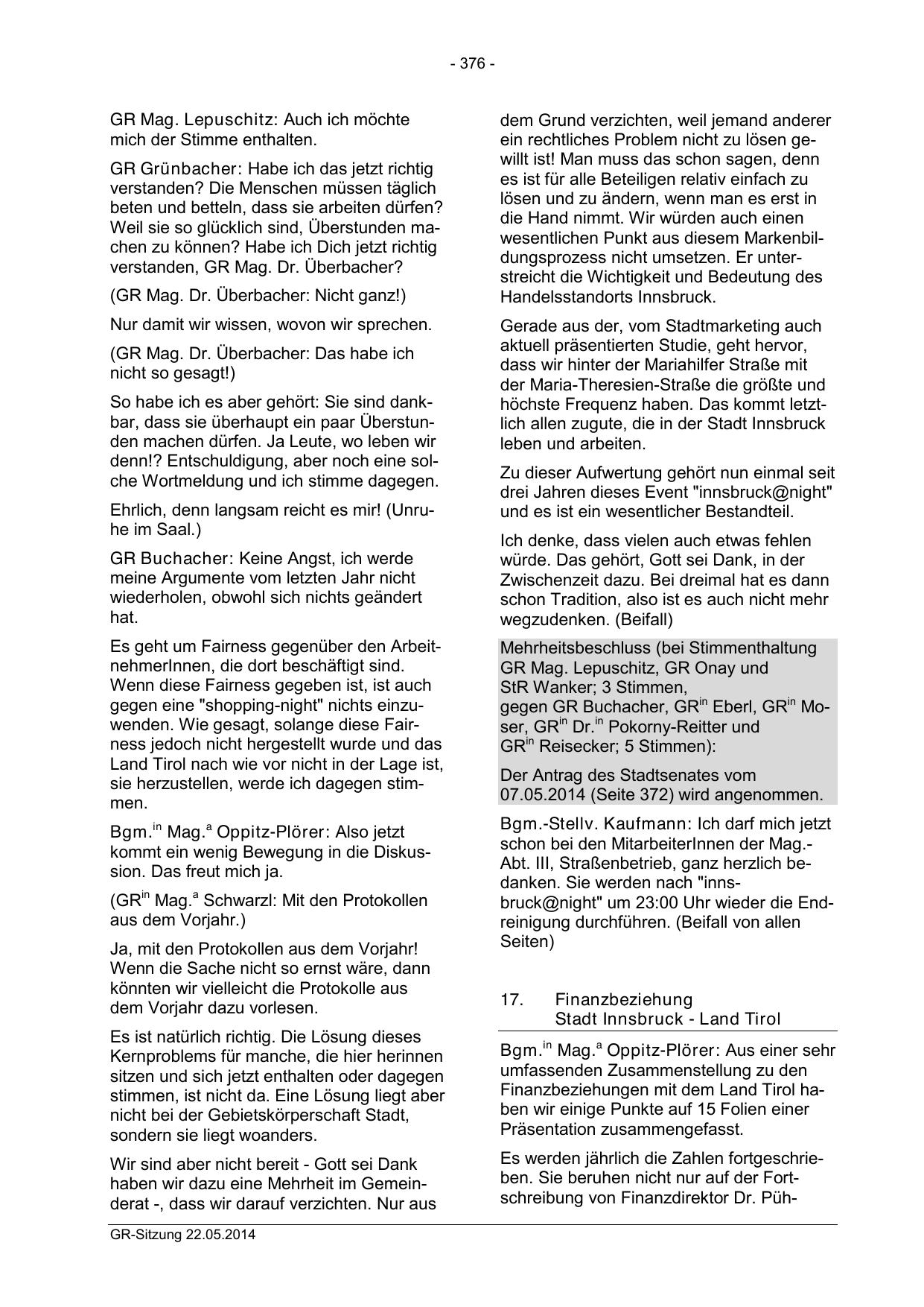 schon bei den MitarbeiterInnen der Mag.Abt. III, Straßenbetrieb, ganz herzlich bedanken. Sie werden nach "innsbruck@night" um 23:00 Uhr wieder die Endreinigung durchführen. (Beifall von allen