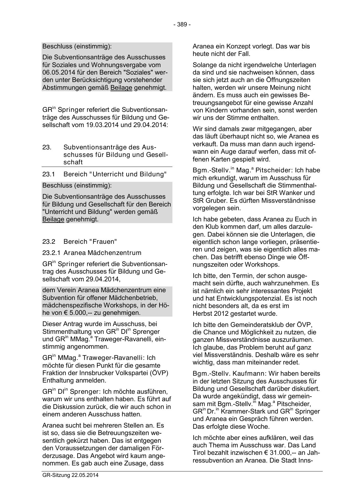 GRin Springer referiert die Subventionsantrag des Ausschusses für Bildung und Gesellschaft vom 29.04.2014,