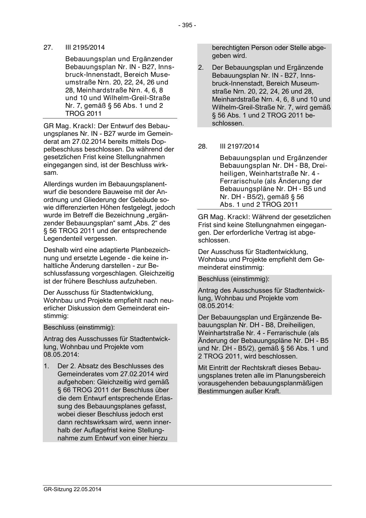 GR Mag. Krackl: Der Entwurf des Bebauungsplanes Nr. IN - B27 wurde im Gemeinderat am 27.02.2014 bereits mittels Doppelbeschluss beschlossen. Da während der