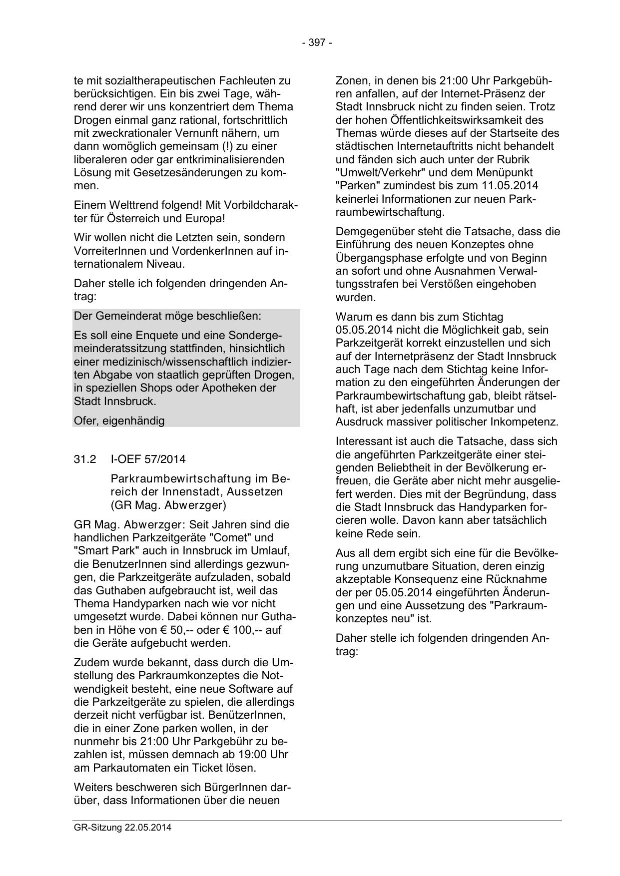 der per 05.05.2014 eingeführten Änderungen und eine Aussetzung des "Parkraumkonzeptes neu" ist.