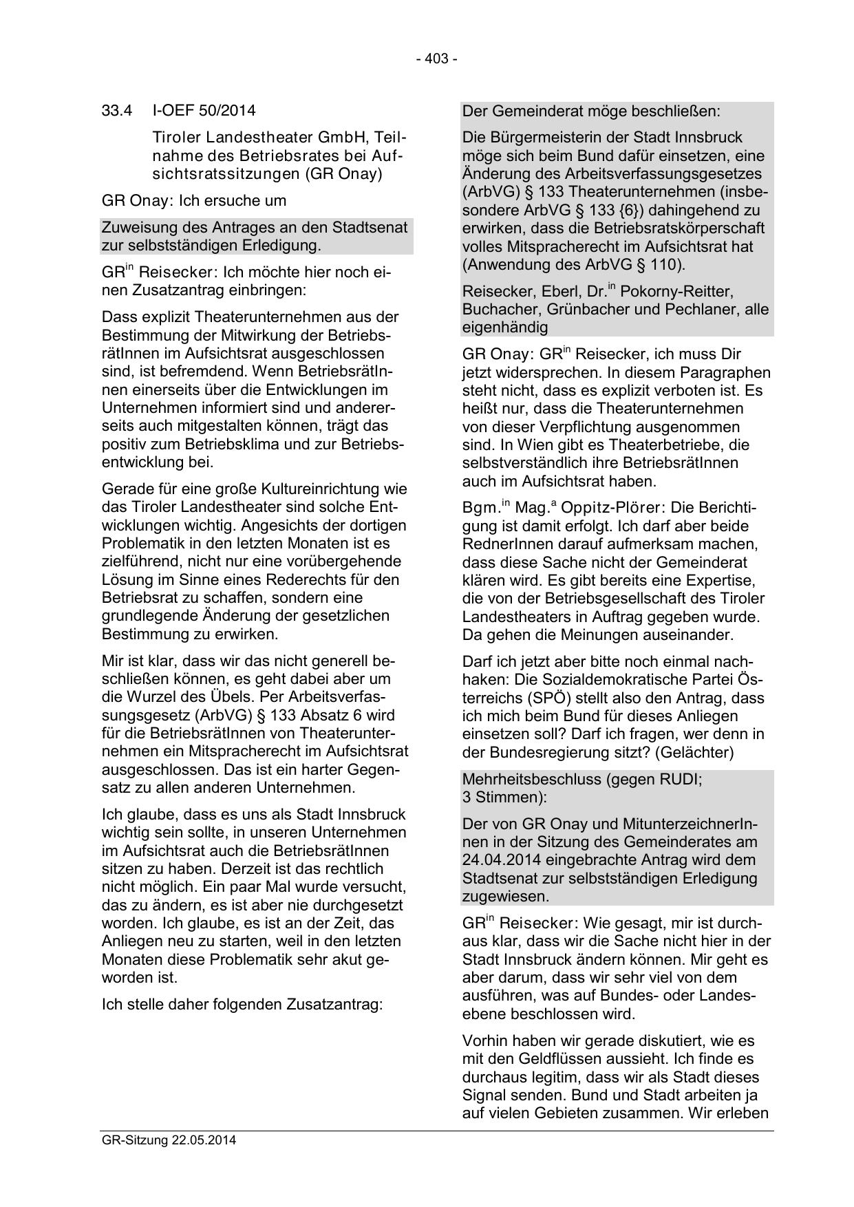 Tiroler Landestheater GmbH, Teilnahme des Betriebsrates bei Aufsichtsratssitzungen (GR Onay)
