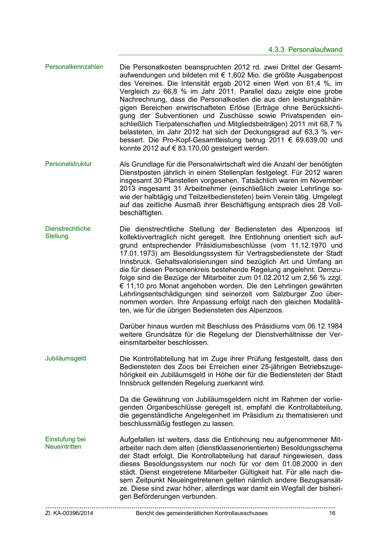 Nachrechnung, dass die Personalkosten die aus den leistungsabhängigen Bereichen erwirtschafteten Erlöse (Erträge ohne Berücksichtigung der Subventionen und Zuschüsse sowie Privatspenden einschließlich Tierpatenschaften und Mitgliedsbeiträgen) 2011 mit 68,7 %