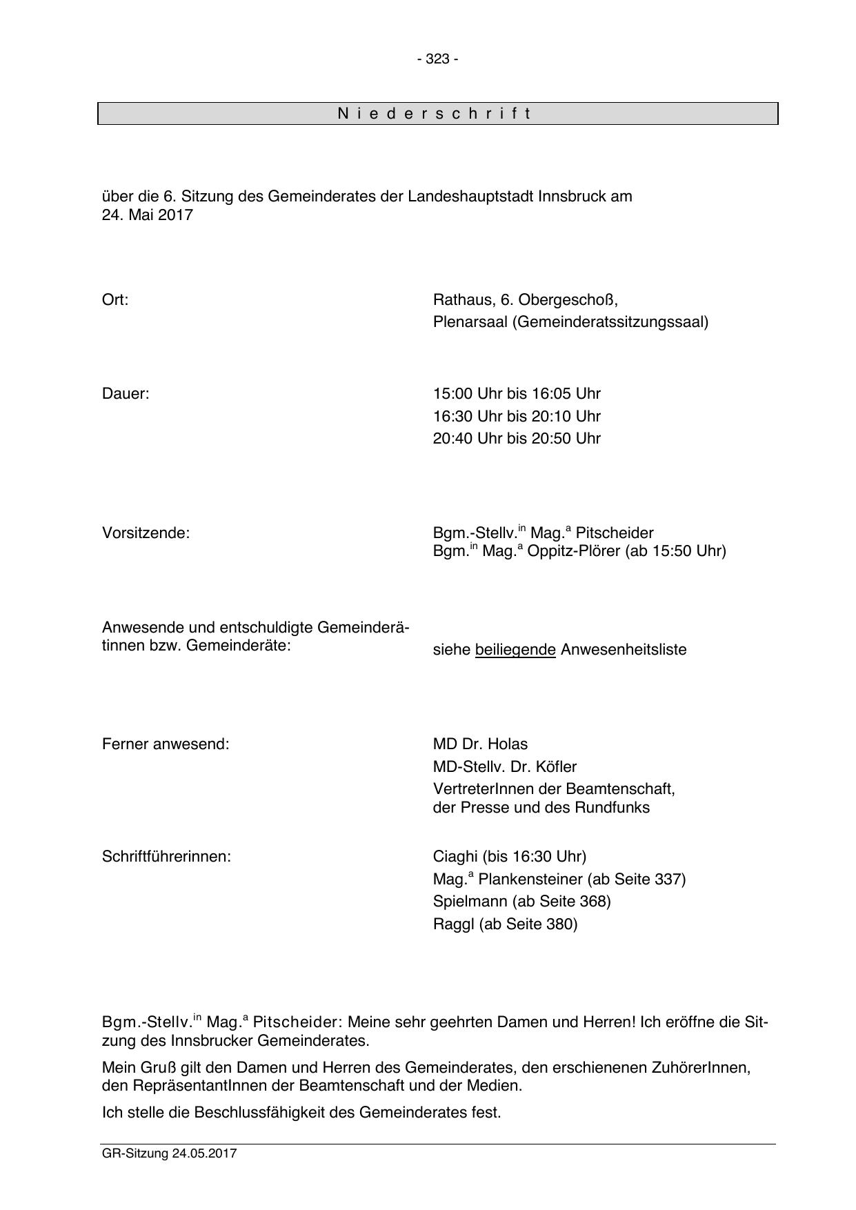 Bgm.-Stellv.in Mag.a Pitscheider: Meine sehr geehrten Damen und Herren! Ich eröffne die Sitzung des Innsbrucker Gemeinderates.